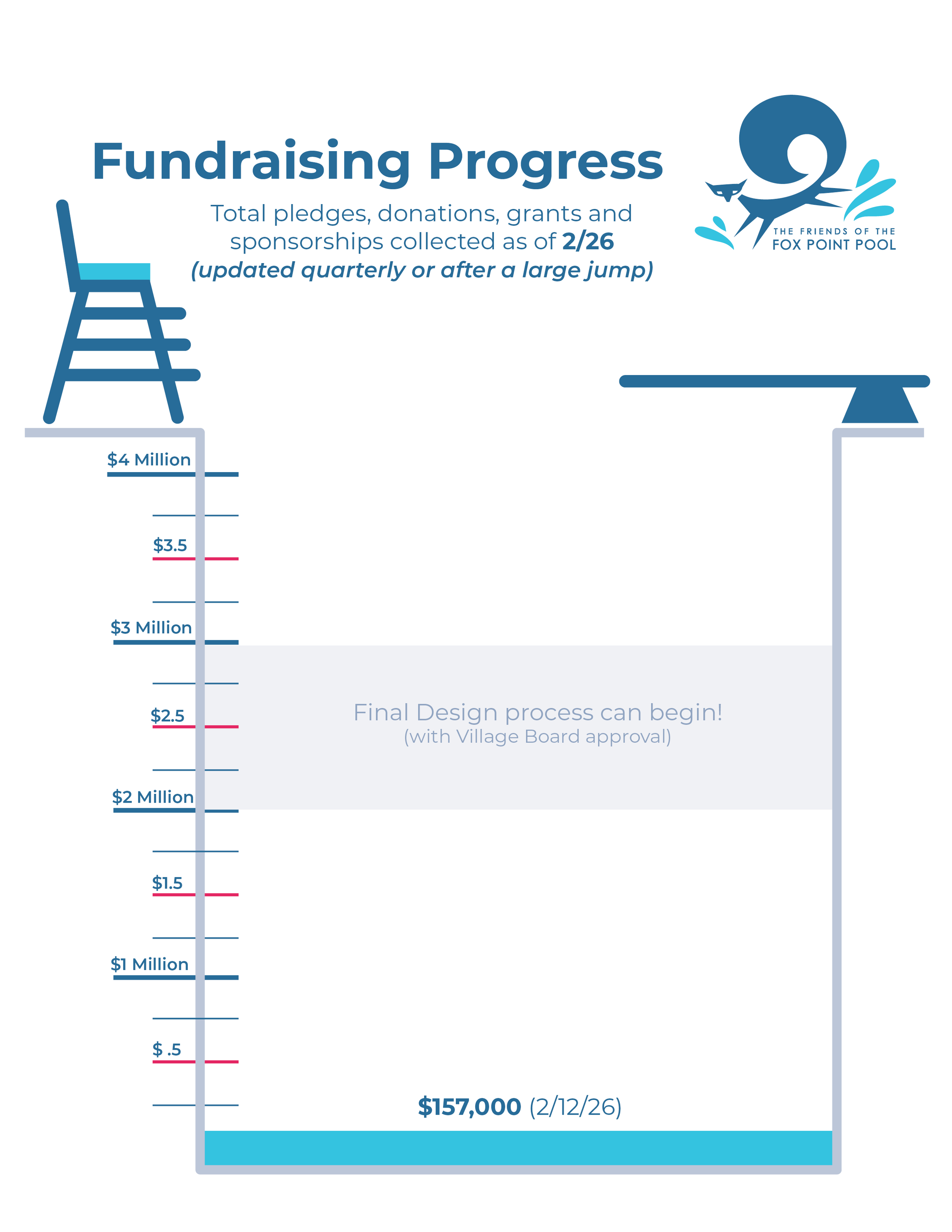 Large fundraising campaigns like ours usually begin as a ‘silent fundraising’ campaign until a certain amount of the goal is met. Due to an overwhelming amount of interest on the status of our fundraising campaign, The Friends of the Fox Point Pool have decided to list our progress thus far publicly to provide transparency surrounding our fundraising efforts. Fundraising progress will be updated periodically as donations are recieved.